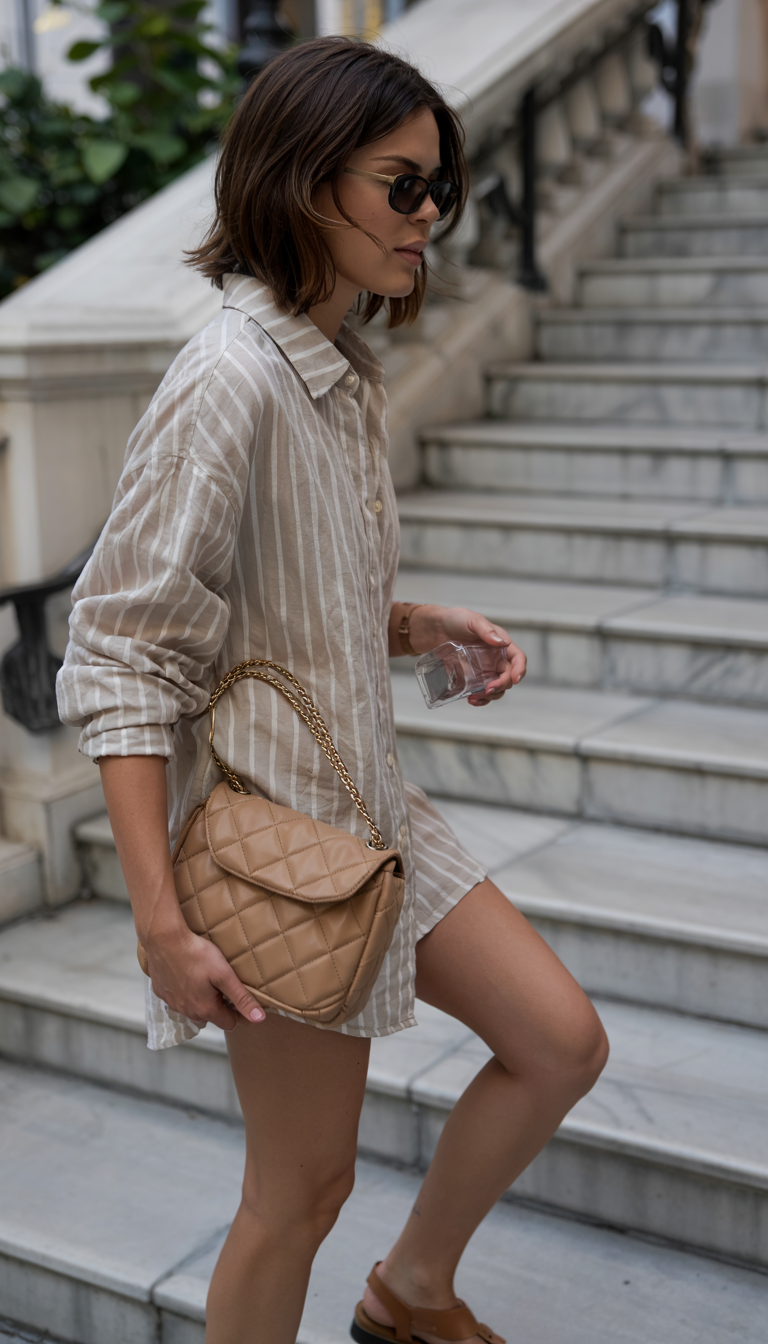 This two-piece ensemble features a sleeveless, cream-colored vest with a small front opening above a V-shaped neck and matching shorts underneath. The textured fabric defines the outfit with an elegant shape while providing comfort during the summer season. The black leather bag serves as a contrasting accessory that reinforces the minimalist quality that characterizes the 2025 fashion for everyday summer fashion. Casually chic women looking for sophistication in warm climates should choose this outfit for 2025.