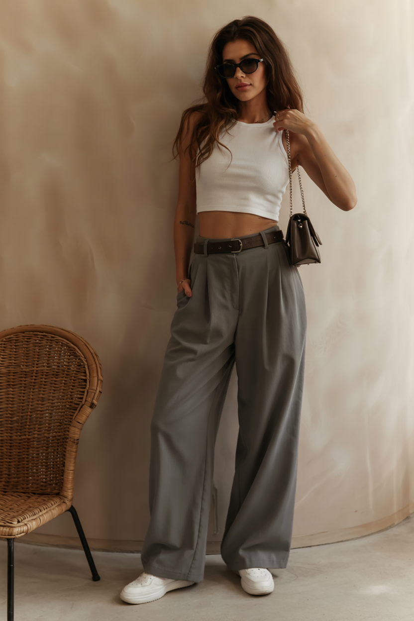 A fashionable marriage of style and comfort is created when the white ribbed crop top is paired with the gray high waist pleated trousers. The wide leg pants offer flexible mobility to suit any body type, especially in the mid-size trend year. This combination of white sneakers with a structured bag and casual white pants is a perfect example of Korean summer fashion. The outfit shines because of its ability to create everyday casual yet powerful summer fashion styles according to Fashion 2025 standards.