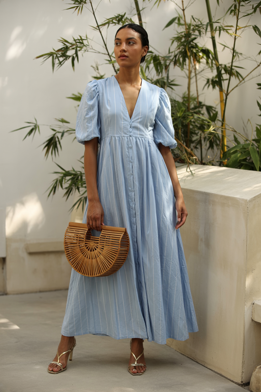 #4 Puff Sleeve Midi Dress in Soft Blue Pinstripes