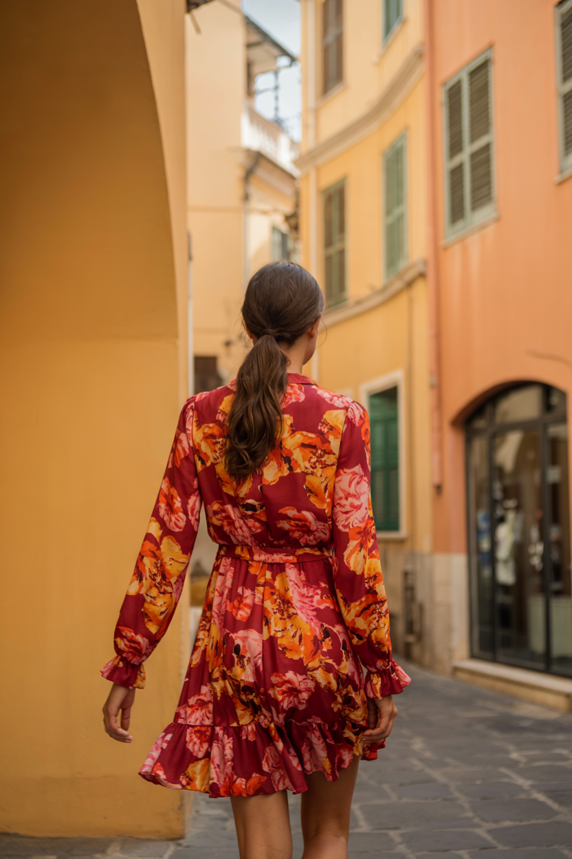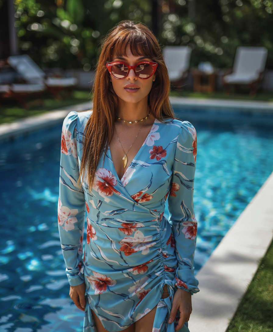 A wrap dress with ruched pleats and ocean blue tones along with red and white floral prints brings elegant ease to summer daytime outfits. This dress features a tight, figure-hugging shape with double long sleeves and uneven ruffles at the skirt. Fashion 2025 showcases this garment among daily summer outfits as it presents a look that goes from beach resort ready to evening elegance. The 2025 fashion lifestyle prefers this outfit shape as their preferred choice to wear a bold yet contemporary feminine style.