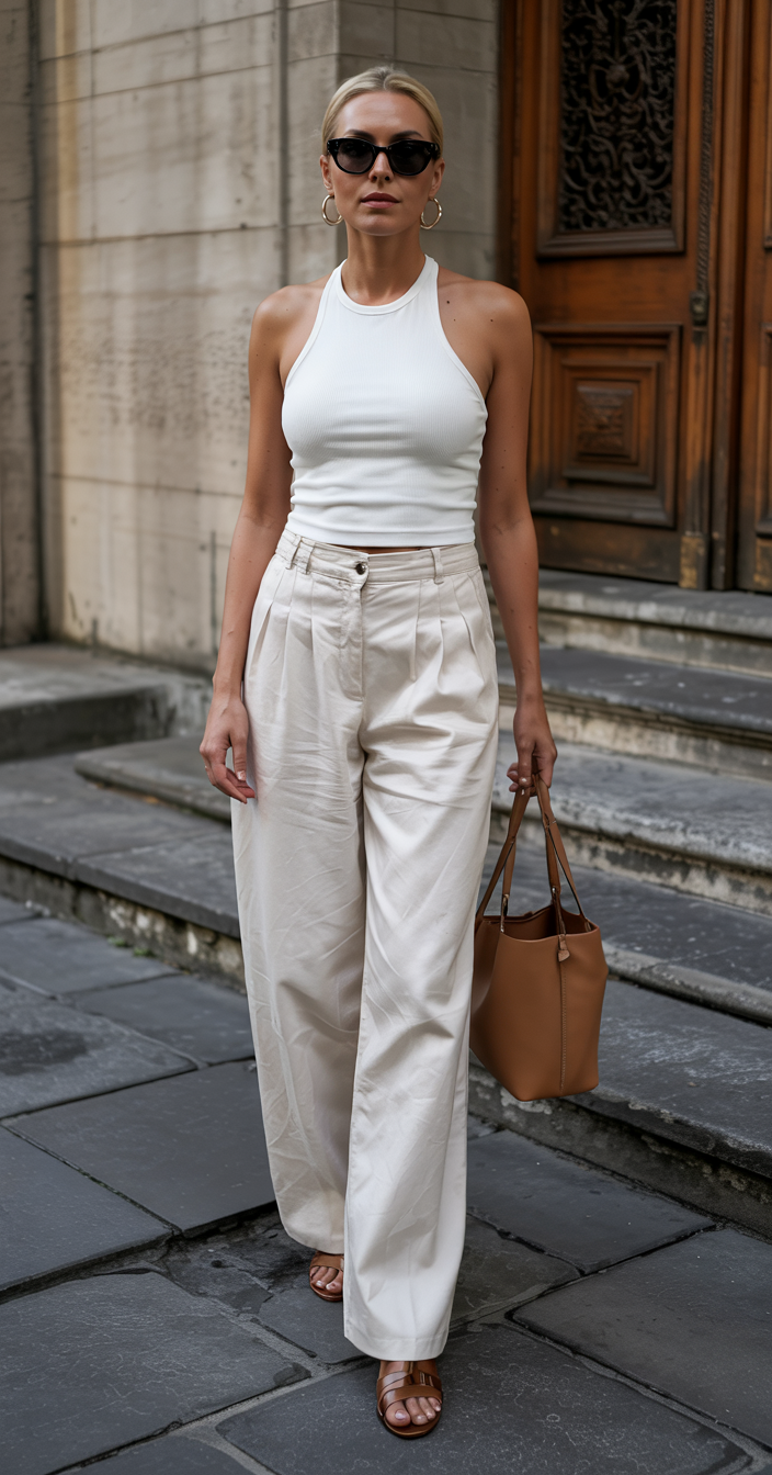 This simple combination pairs a white ribbed racerback shirt with high-waisted, pleated beige pants for a sophisticated yet comfortable casual look. This outfit retains elements of comfort while maintaining structural consistency, in keeping with Fashion 2025’s Daily Dressing Guidelines for the summer of 2025. The classiness of the monochromatic outfit is enhanced by leather sandals paired with a structured brown tote that would be perfect for both outdoor walks and urban settings. This ensemble suits 2025 clients who prefer contemporary, minimalist designs.