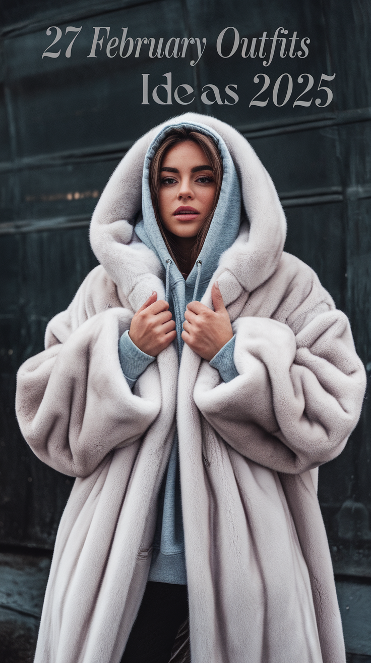 This floor-length gray fur coat exudes luxury, paired with a fitted taupe turtleneck and light blue wide-leg jeans. The quilted black handbag adds a touch of sophistication, while the oversized sunglasses complete the aesthetic. Ideal for upscale city strolls in London or Japan, this ensemble is a standout choice for February outfits ideas 2025.