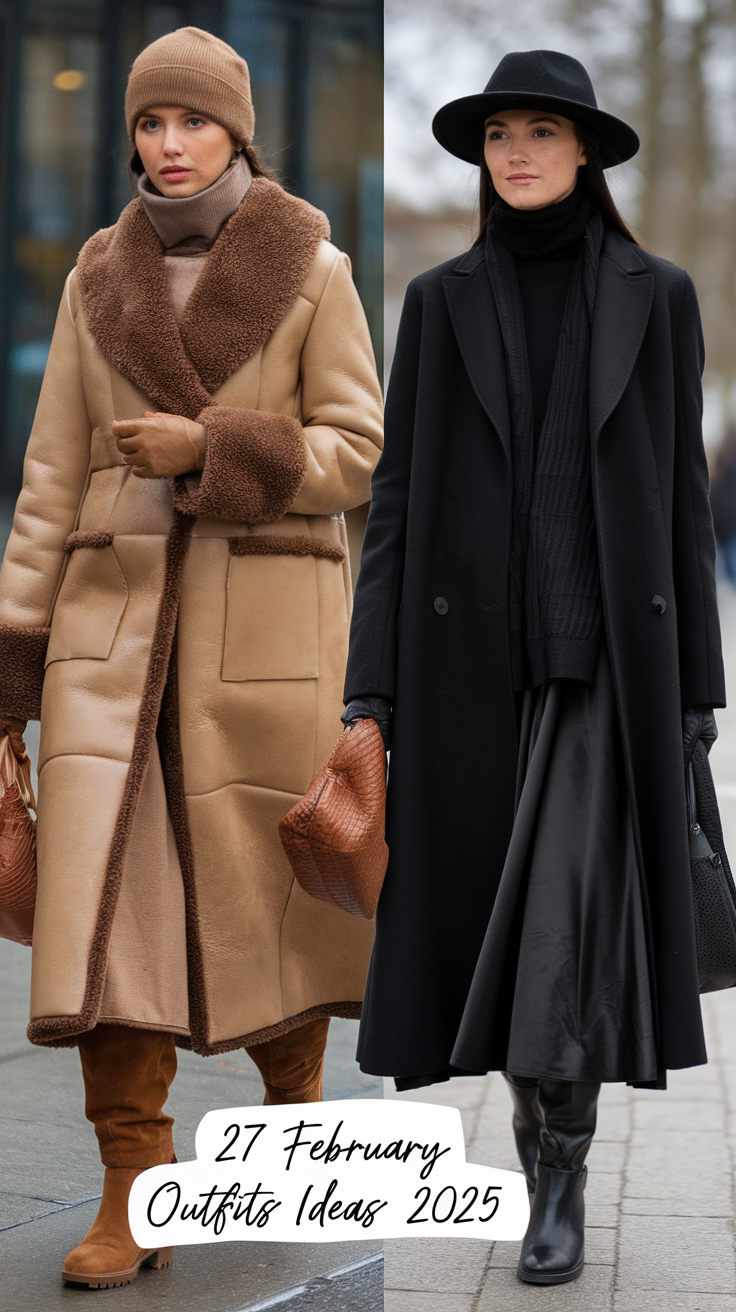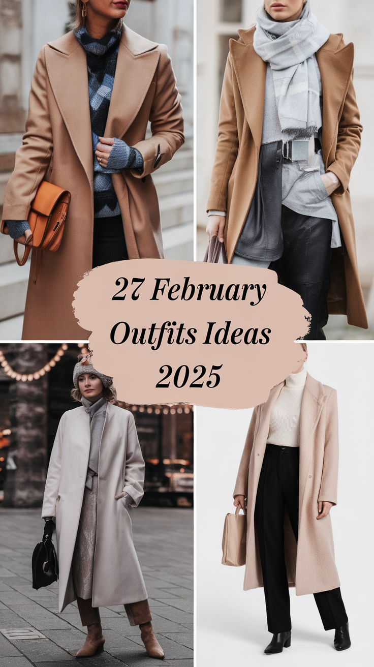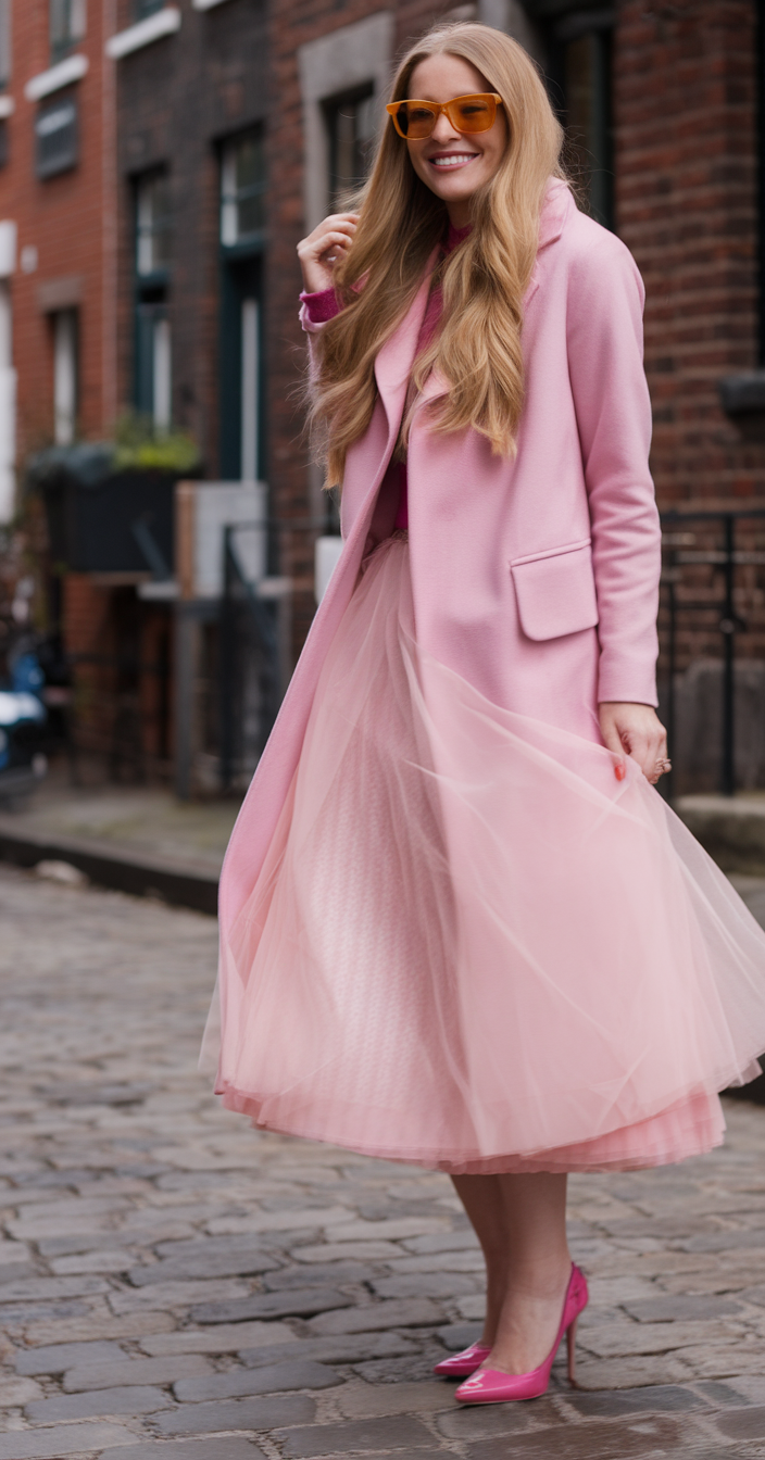 This soft pink overcoat paired with a flowing tulle skirt offers a dreamy, aesthetic look for parties or college events. The pink pumps add a playful touch, making it perfect for February outfits ideas 2025. Whether strolling through Amsterdam or attending dinner, this mid-size friendly outfit radiates charm and femininity.