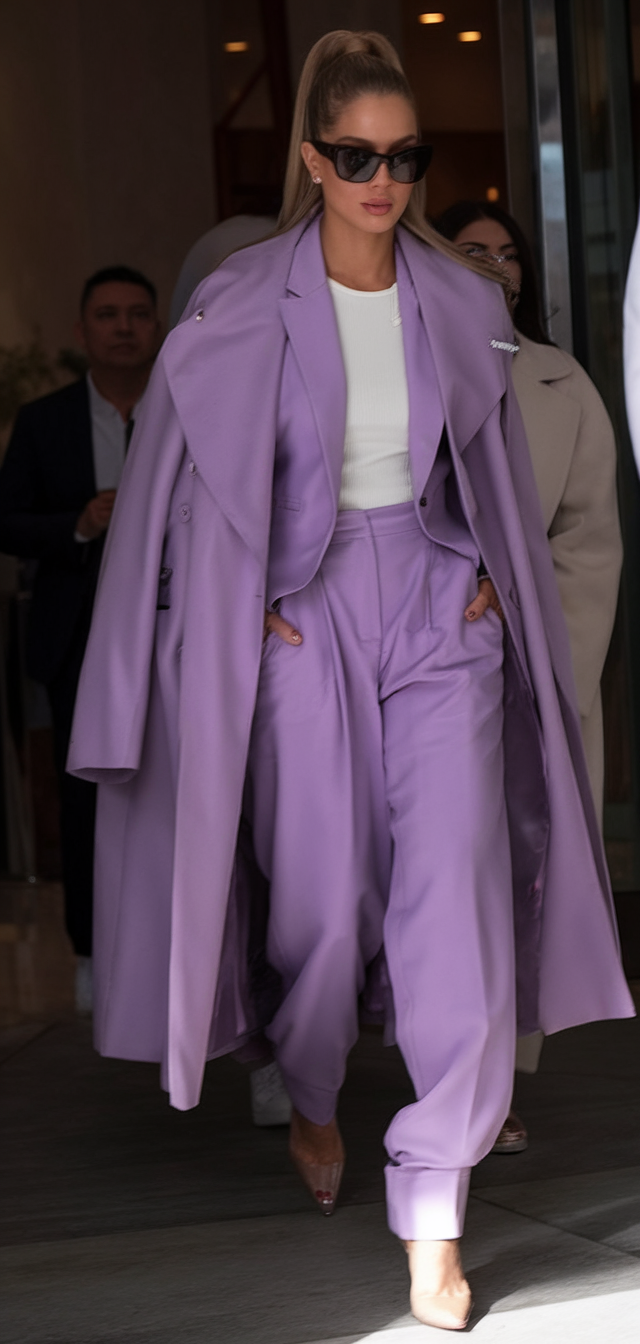 A structured lavender pantsuit paired with a crisp white top exudes sophistication and modern charm. The wide-leg trousers and long coat bring a sleek aesthetic, perfect for work or dinner in Amsterdam. Clear heels and oversized sunglasses add contemporary elegance, making this a striking February outfits ideas 2025 option.