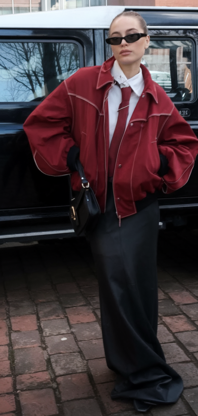 This oversized burgundy jacket with contrast stitching pairs stylishly with a sleek black maxi skirt for a polished yet casual vibe. A white shirt and matching burgundy tie add a playful twist, while small black accessories enhance the minimalist appeal. Ideal for a college or party look, this outfit embodies athleisure with a touch of sophistication.