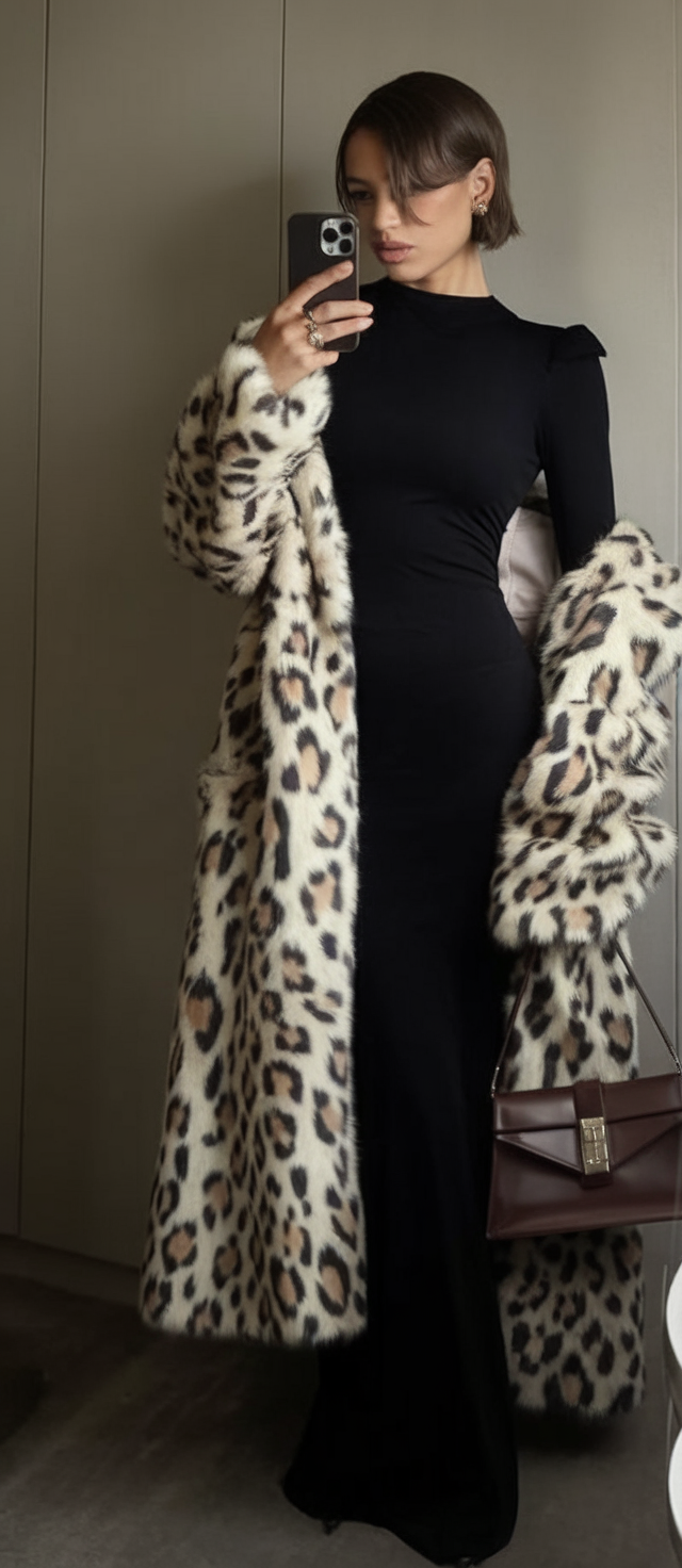 A striking leopard-print coat layered over a form-fitting black gown creates a bold and elegant look. Paired with a structured brown handbag and delicate gold jewelry, this outfit embraces classic sophistication. Perfect for a dinner or party in Vegas, it’s a timeless option for women embracing 2025 fashion trends.