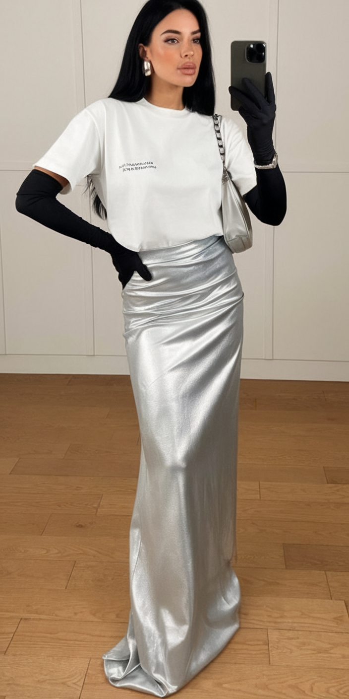 A sleek silver maxi skirt paired with a simple white graphic t-shirt creates a modern and minimalist aesthetic. Black opera gloves and oversized earrings elevate the outfit, while a silver shoulder bag complements the metallic tones. Ideal for a party or dinner in Vegas, this look is both sophisticated and edgy.