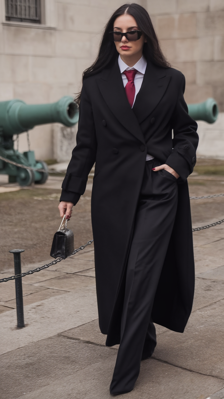 This black double-breasted coat is styled over tailored wide-leg trousers and a white shirt with a bold red tie, exuding confidence. A small structured black bag and dark sunglasses complete the ensemble, adding polished details. Perfect for work or church, this outfit is a timeless February outfits ideas 2025 option.