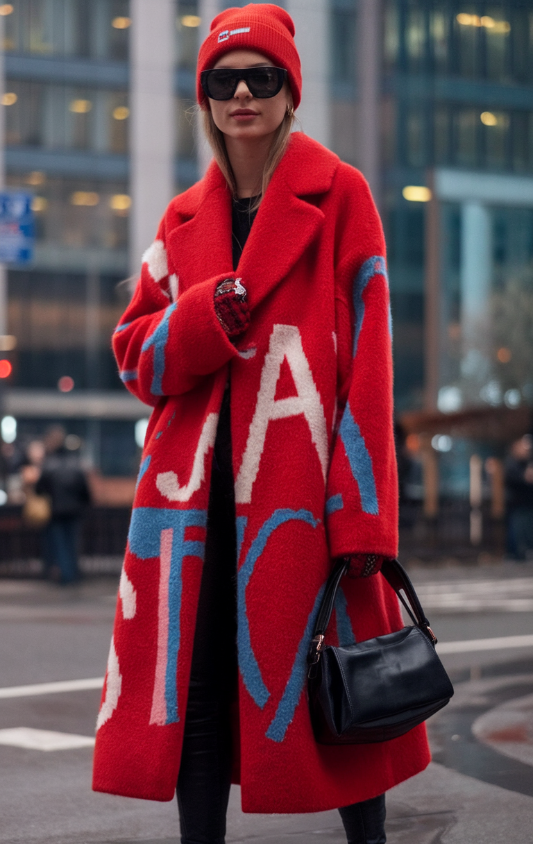 A striking red coat featuring bold graphic text overlays adds vibrancy and edge to this look. Paired with a matching red beanie and sleek black accessories, the outfit balances color intensity with functional elements. The structured design of the coat is ideal for creating a modern winter aesthetic while staying cozy and stylish.