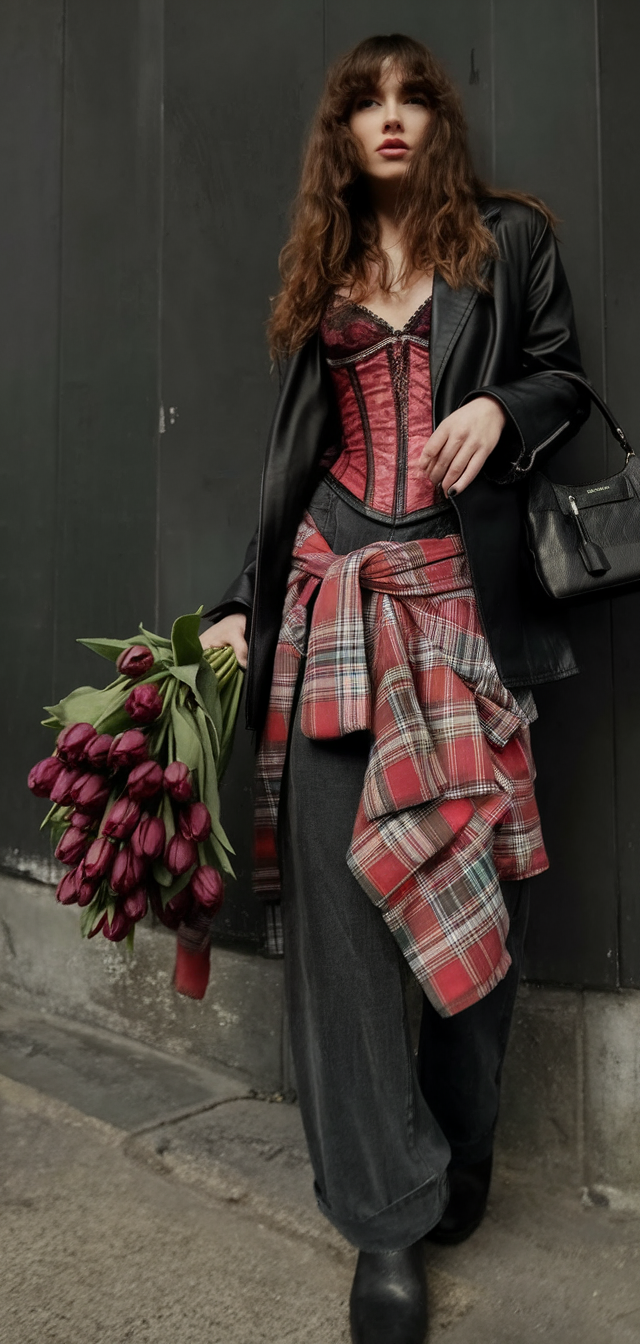This outfit combines a rebellious vibe with feminine charm, featuring a plaid flannel tied at the waist and a burgundy corset top. The addition of a sleek black leather jacket and wide-leg trousers brings structure and balance. It’s a creative, layered look perfect for urban style statements.