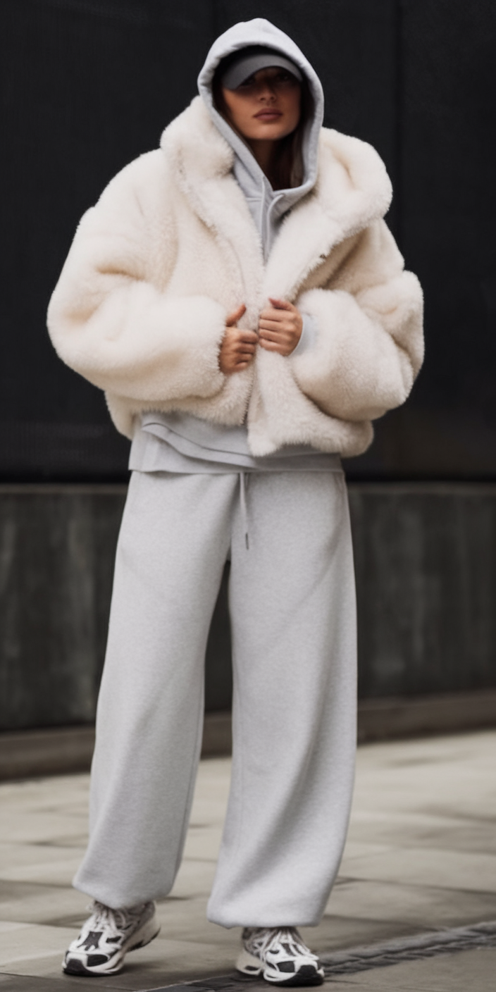 A plush, oversized cream shearling jacket pairs effortlessly with a light gray hoodie and wide-leg sweatpants for a casual, sporty vibe. The outfit is completed with monochrome running sneakers, adding a modern edge to the relaxed silhouette. The neutral palette creates a chic, understated aesthetic perfect for laid-back outings.