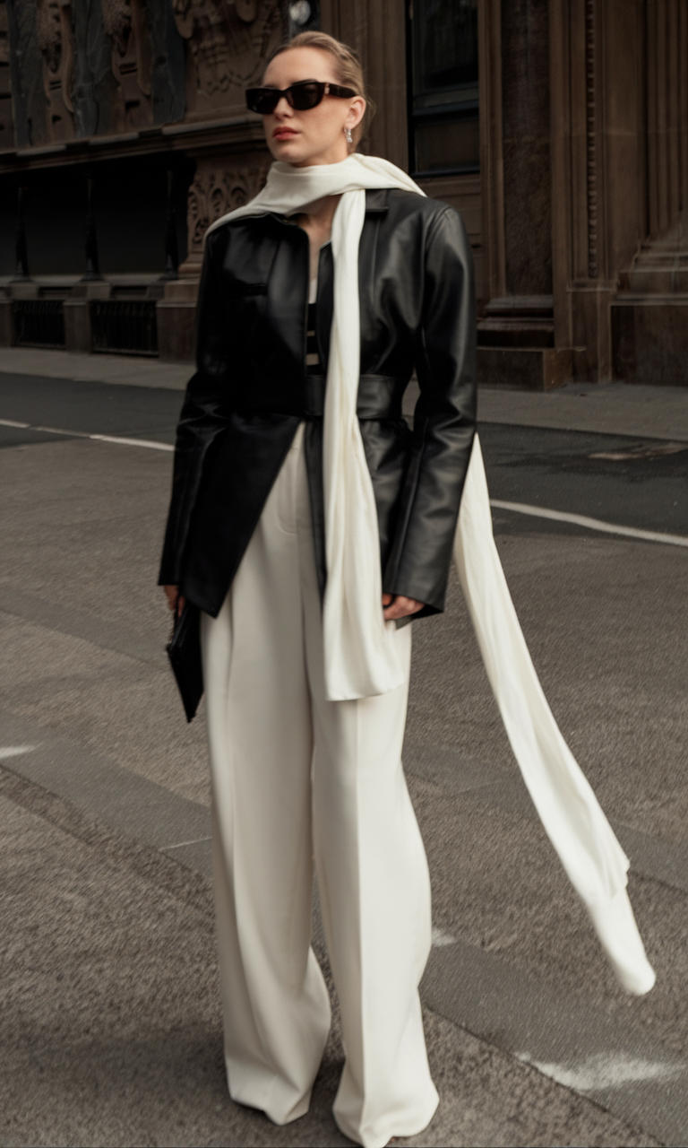 This outfit exudes modern sophistication with a structured black leather jacket cinched at the waist, highlighting its tailored design. Paired with wide-leg white trousers, the ensemble creates a striking monochrome contrast, amplified by the soft texture of the flowing white scarf. The clean lines and minimalistic approach emphasize a polished and confident look.