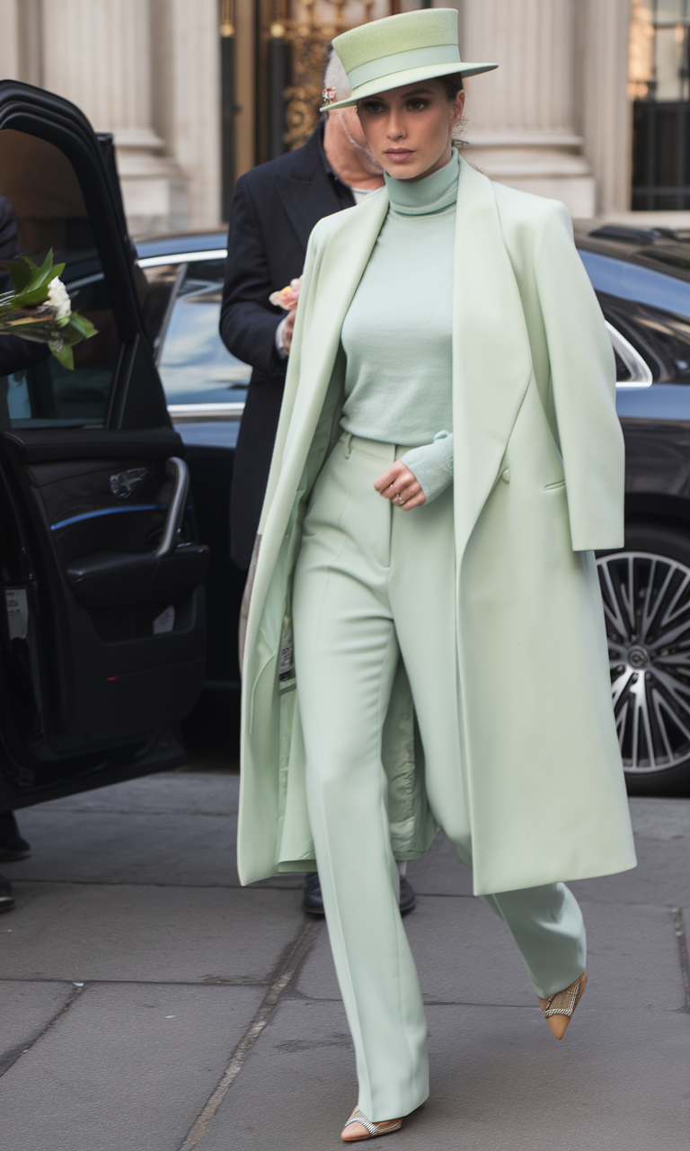This coordinated mint green outfit embraces refined elegance. The tailored coat drapes effortlessly over the matching turtleneck sweater and high-waisted trousers, creating a seamless tonal harmony. The structured silhouette of the ensemble, paired with a statement mint green hat, evokes a sense of timeless grace and modern flair.