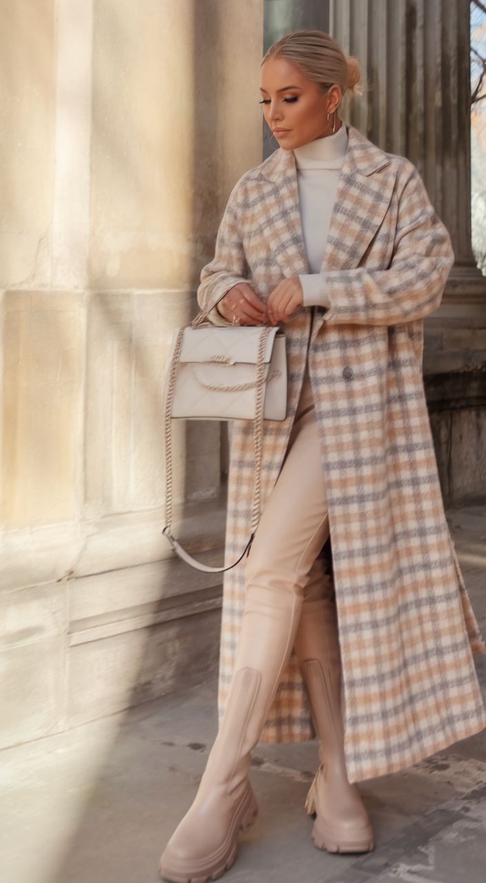 A long, plaid-patterned coat takes center stage, blending warm beige tones with soft grays. It’s paired with sleek cream-colored leather trousers and matching chunky knee-high boots, balancing structure with comfort. The quilted ivory handbag adds a touch of luxe to this chic, layered winter look.