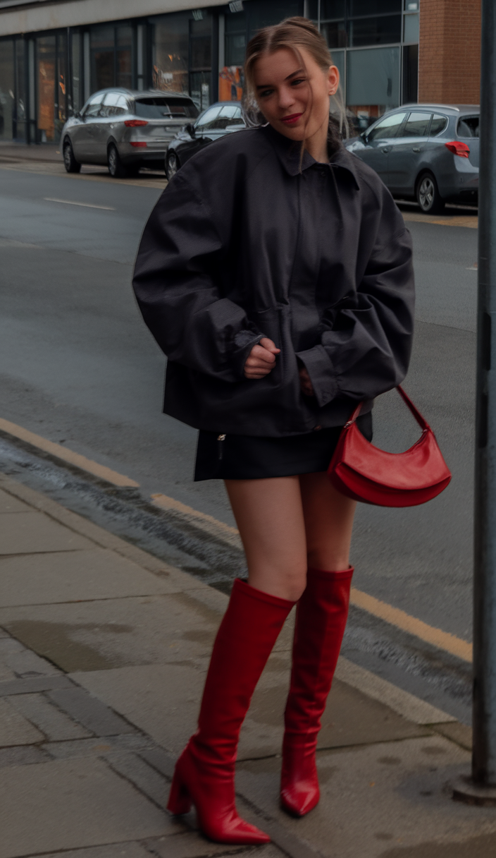 An oversized gray jacket paired with a black mini skirt achieves a bold, athleisure-inspired style. Red knee-high boots and a matching handbag provide striking contrast, making it ideal for Vegas or Japan outings. This casual yet trendy look captures the essence of 2025 fashion with its edgy, minimalist appeal.