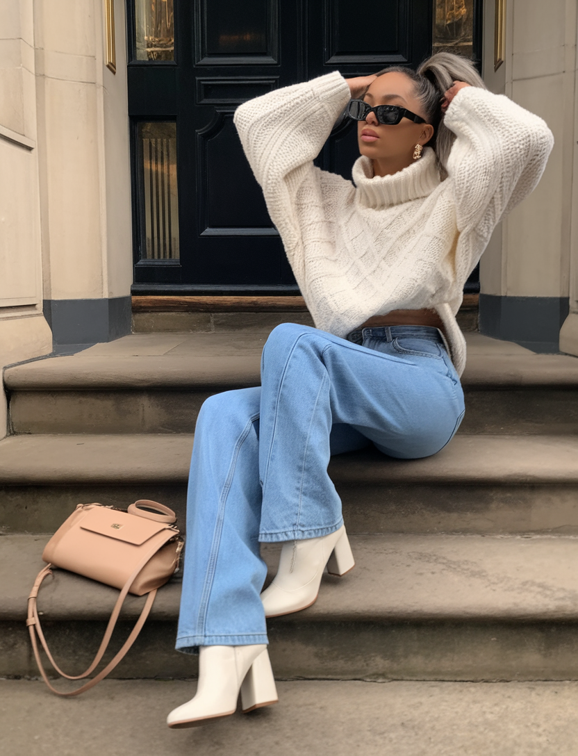 A chunky white cable-knit sweater tucked into high-waisted light-wash jeans creates a comfortable yet chic aesthetic for casual outings. The white block-heeled ankle boots and a neutral beige handbag complete this minimalist look, perfect for exploring London or a casual dinner in Las Vegas. This 2025 fashion idea balances warmth and style, ideal for winter days.