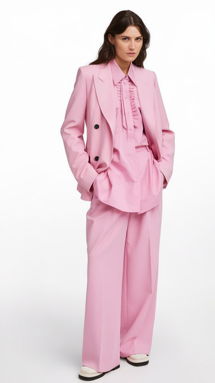 A pastel pink suit featuring a structured blazer and wide-leg trousers brings a polished yet playful vibe to work or dinner events. The ruffled blouse adds a feminine touch, while white sneakers keep the look modern and approachable. This mid-size friendly outfit is perfect for college, India, or stylish outings in Vegas.