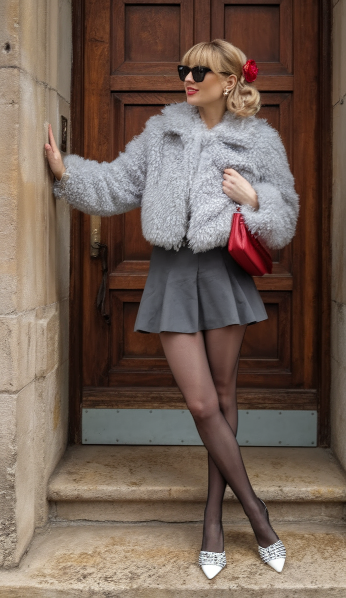 This look combines a soft gray faux-fur jacket with a flared gray mini skirt, creating a playful yet elegant aesthetic. Black tights and pointed heels with patterned accents enhance the outfit’s versatility for winter outings or casual dinners. A bright red handbag and floral hair accessory add pops of color, perfect for a stylish Vegas or London evening.