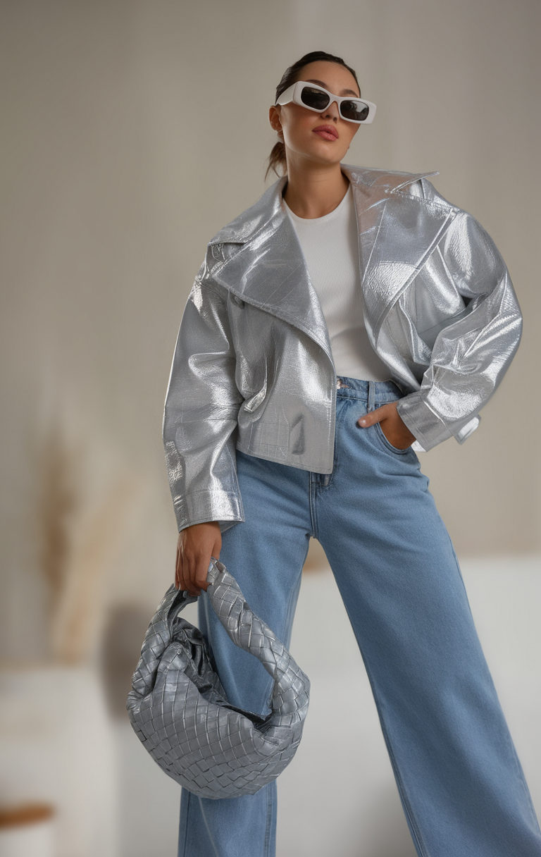 A silver metallic cropped jacket over a white top pairs effortlessly with light blue wide-leg jeans, striking a balance between casual and futuristic. The matching woven metallic handbag and white sunglasses complete this bold 2025 fashion choice. This look is ideal for Las Vegas, Japan, or exploring urban streets with a modern edge.