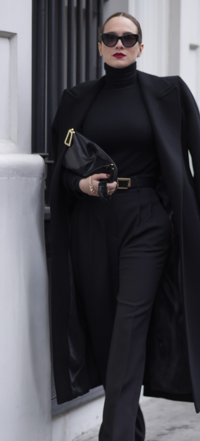 This monochromatic outfit features a tailored black turtleneck tucked into high-waisted black trousers for a sleek and modest silhouette. A long black coat and structured clutch add sophistication, while oversized sunglasses and red lipstick elevate the look. Perfect for work, church, or stylish February outfits ideas 2025 in London or Amsterdam.