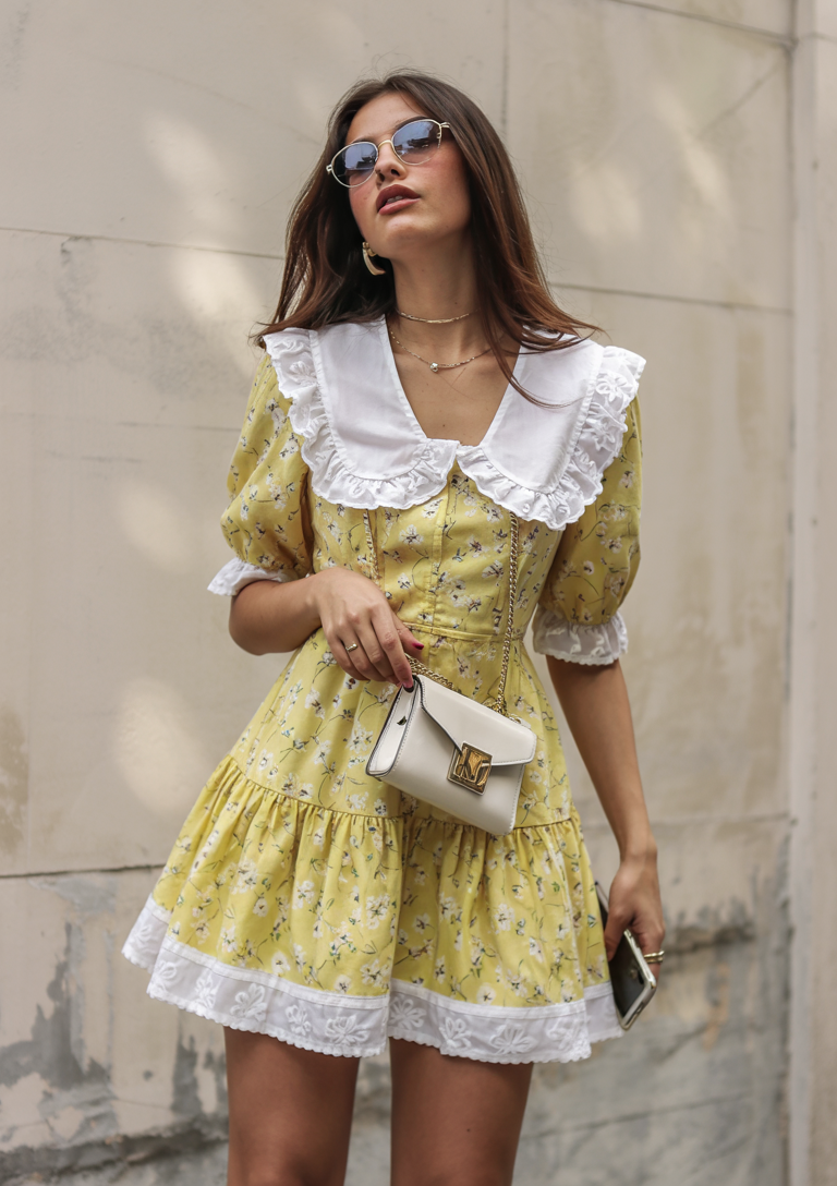 The short yellow floral dress presents vintage sweetness through its white collar design combined with refined lace trim around the edge. The outfit combines puffed sleeves with a fitted waist to create proportionate measurements that work just as well at garden parties in London as they do at tea meetings in Japan. This outfit combines playfulness with intricate detailing to create a feminine look that stands out from the many outfit ideas for 2025. Women who want to express spring romance can finish their outfits with a structured mini bag and delicate jewelry.
