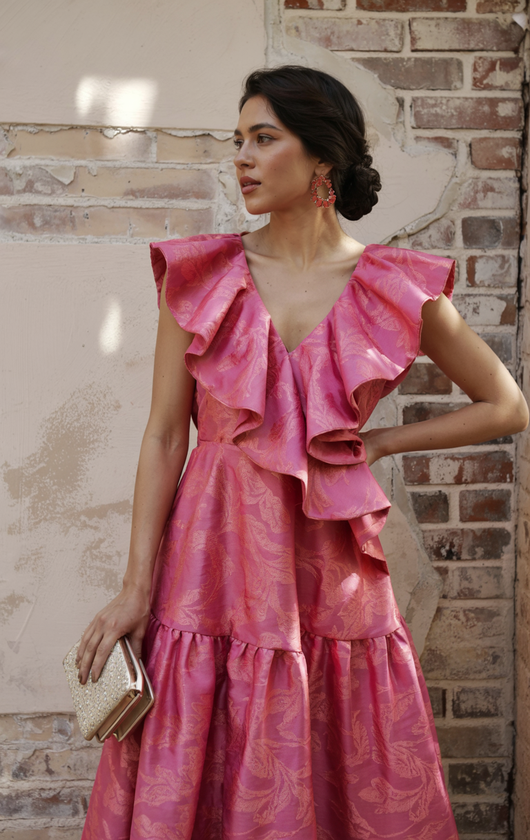 A fuchsia dress with ruffles at the neckline and throughout the bodice creates a dramatic look that is equally at home at New York nightlife events as it is at parties in Paris. A subtle floral pattern is woven into the fabric design, adding sophistication and refinement without extra embellishment. The dress features a loose silhouette that allows for freedom of movement and is perfect for Greek summer celebrations. This fashionable piece positions itself as an ideal option for women who want to make an impact in the 2025 fashion period.