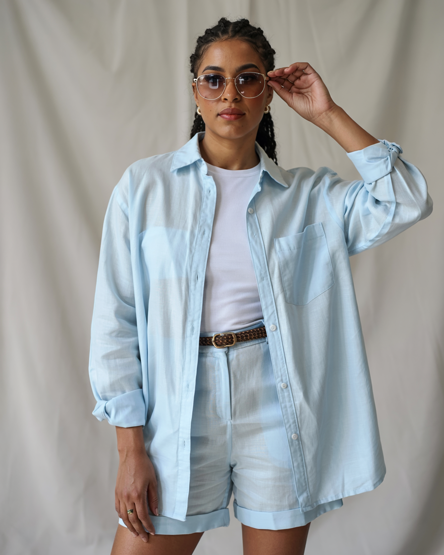 A casual two-piece ensemble features a soft blue button-up shirt under a set of matching shorts with a rolled hem for a stylish yet relaxed look. The white tank top keeps the basics simple, but the brown woven belt adds some shape to the ensemble. This outfit is suitable for travelers to Japan and offers Amsterdam residents fashionable comfort throughout the month of May as it combines comfort with simple elegance. The outfit ranks as a standout option among the 2025 fashion predictions for women’s everyday wear.