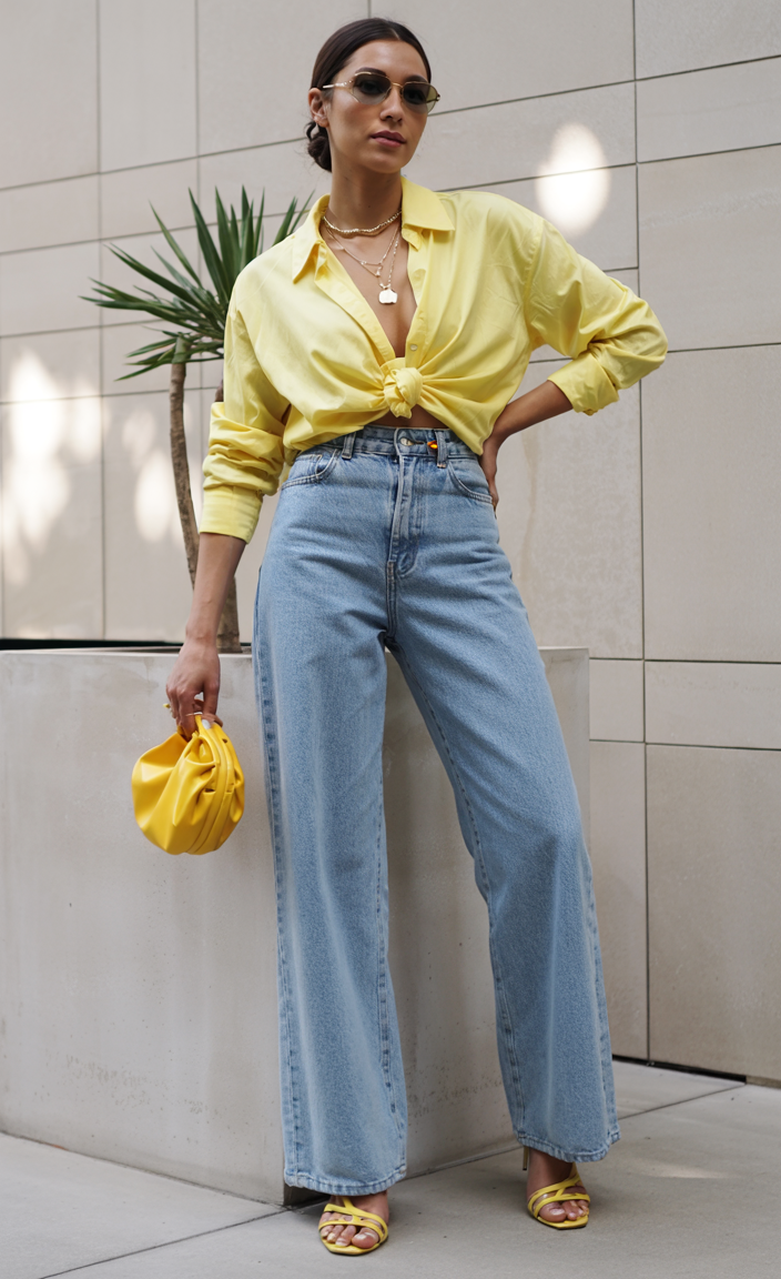 The combination of a yellow shirt tied at the waist and high-waisted denim gives you an eye-catching spring vibe. This outfit maintains a comfortable style with the wide-leg jeans, as they offer a flattering shape while remaining casual for time spent in Paris or New York. The yellow mini bag and strappy sandals create an upscale and fresh look when paired together as accessories. Women will find this outfit best suited to the May weather conditions in London and Amsterdam when the days are warm.