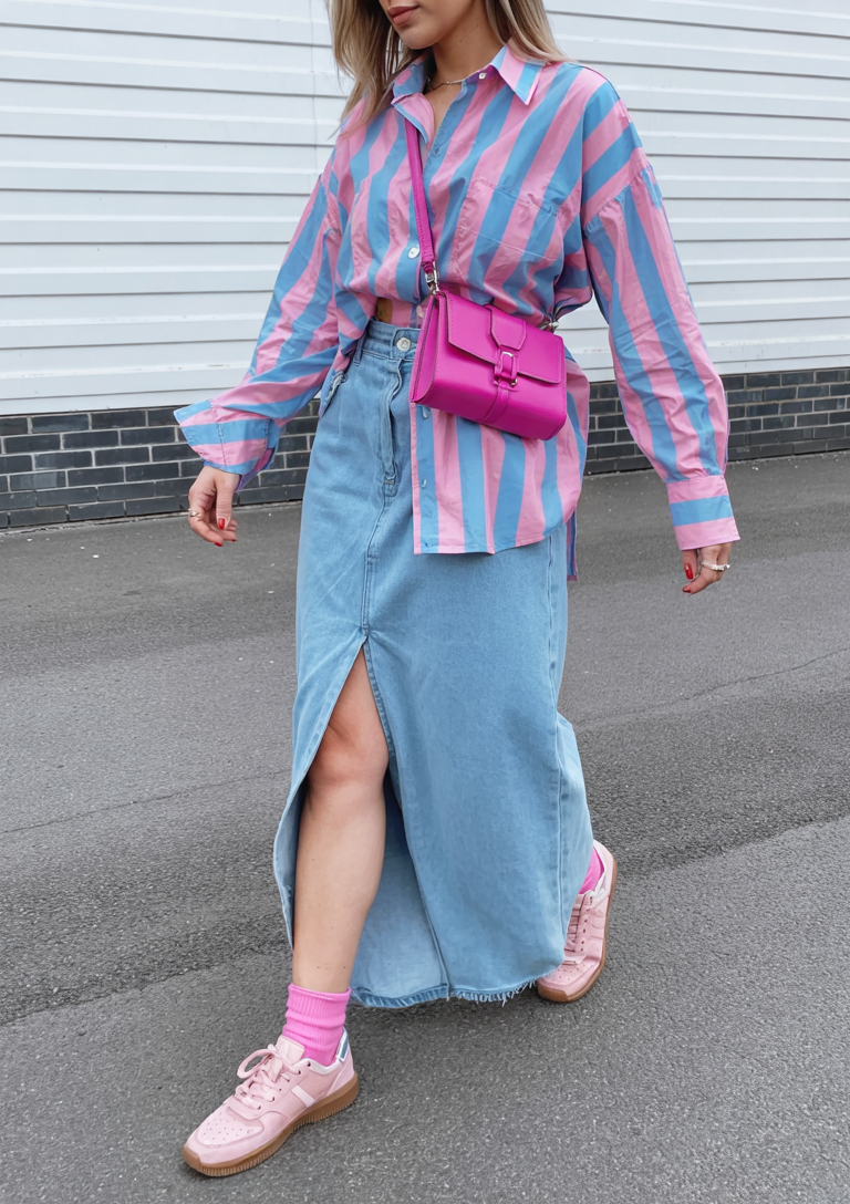 #10 Candy striped shirt with denim midi skirt and sneakers