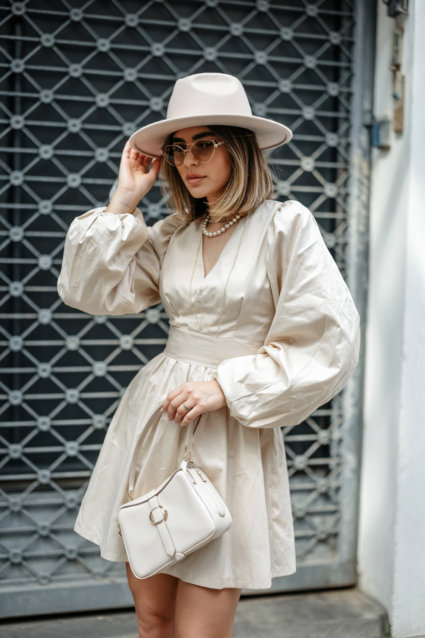 A cream-colored mini dress with dramatic puff sleeves and a plunging V-neckline creates a sophisticated, elegant frame. Designed with a cinched waist and full flowing skirt, the dress is flattering on all body types and can be worn to museums in London as well as to work in the mild spring weather of Amsterdam. This outfit features a structured mini handbag and a wide-brimmed sunhat, making it suitable for both daytime and nighttime occasions. European women will find this ensemble an excellent example of this season’s fashion.