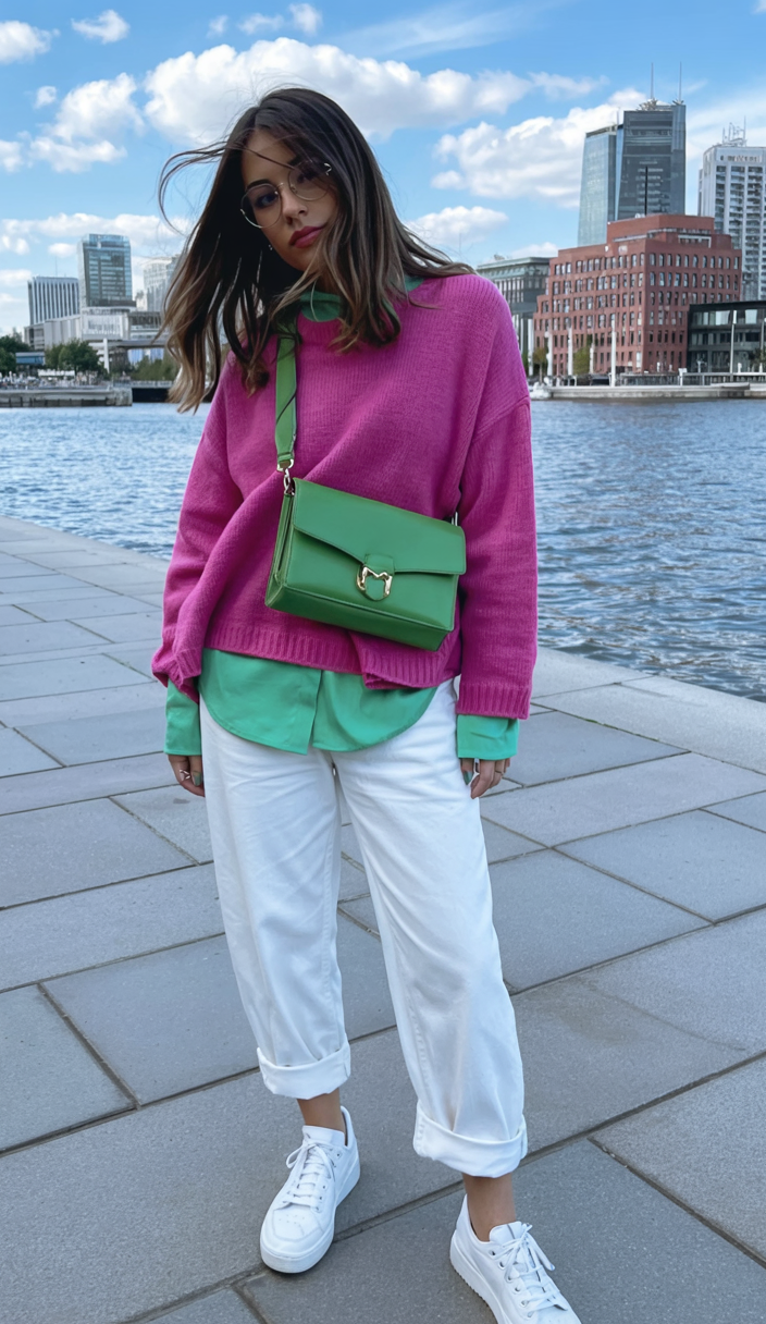 The combination of a fuchsia sweater with a mint green shirt reveals an edgy colorblocking that harmonizes with white rolled-up jeans and basic sneakers. This ensemble offers both fun and organized elements to transition between the seasons of spring in Paris as well as Amsterdam. The green satchel acts as the main accessory point, unifying the color theme while attracting attention. The outfit provides appropriate modesty for traveling and working remotely throughout the month of May for female consumers.