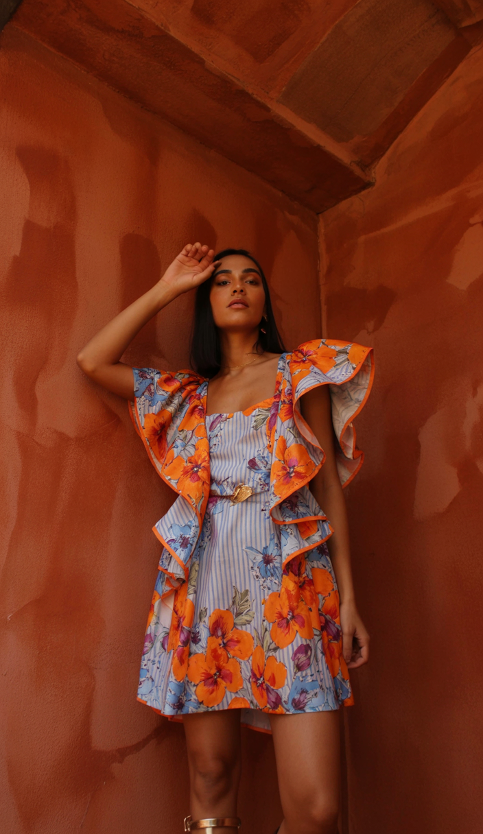 This orange floral mini dress features large ruffles on blue and white striped fabric. The textured bodice and gold belt make this dress suitable for elegant daywear events, where it will work just as well on island vacations in Greece or rooftop gatherings in Las Vegas in 2025. This outfit delivers both lightness and visual power, establishing its position as a standout spring fashion statement. An artistic yet wearable choice for expressive women in summer mode.