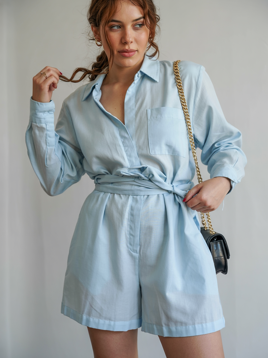 A contemporary take on the casual romper, this outfit features a shirt-style design with soft, relaxed patterns. The soft light blue fabric of this outfit offers a fresh breeze, making it ideal for Parisian summer days, but also suitable for all Japanese charm. Women in 2025 can achieve an attractive waistline and structure with the self-tie belt that perfectly shapes their figure. Minimalist sandals or sneakers work perfectly with this outfit when transitioning from work activities to weekend getaways.