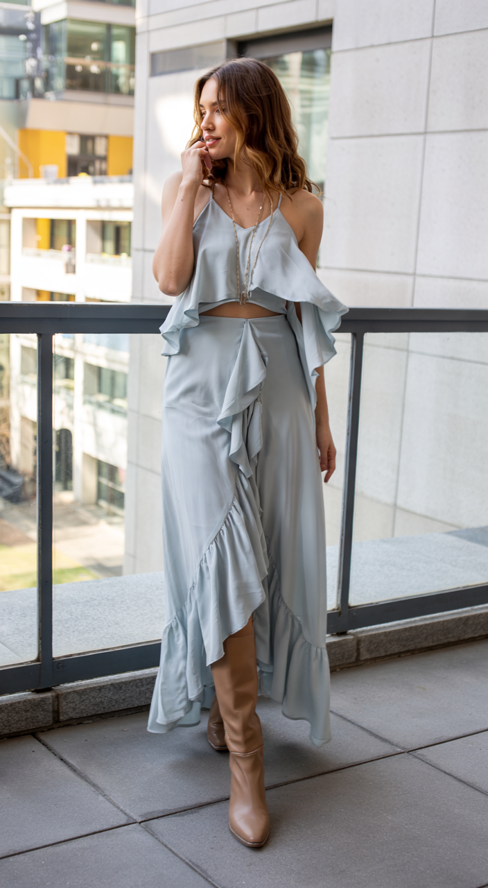 This flowing, ruffled two-piece offers a romantic, feminine look that is perfect for late May European weather conditions. The combination of thin layers on top and bottom makes this outfit suitable for both London and Amsterdam in spring. Neutral boots with a substantial heel lengthen and elevate this ensemble to meet the demands of dinner or rooftop events. Martha’s bohemian Vegas style appeals to women who choose this outfit.