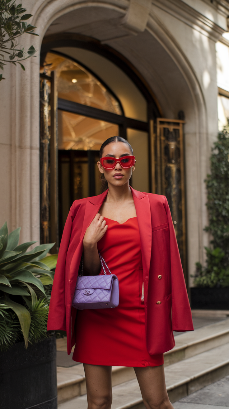 A vibrant red blazer paired with a matching mini dress creates a bold and trendy look, perfect for autumn-winter outings or a Coldplay concert. The lilac quilted bag adds a playful contrast, making it a great choice for Christmas or Eid celebrations.