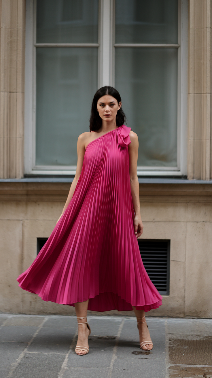 This one-shoulder fuchsia dress features intricate pleating and an asymmetrical hemline, perfect for spring gatherings or Coachella. Its breezy, elegant design makes it ideal for de outfits para año nuevo or class of celebrations.