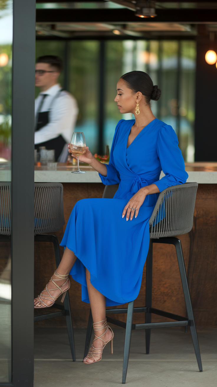 A bright blue wrap dress with a midi-length hem and gathered waist exudes sophistication, making it a great choice for autumn-winter evenings or a Tate McRae concert. Paired with strappy gold heels, it’s a timeless option for Eid or Christmas parties.