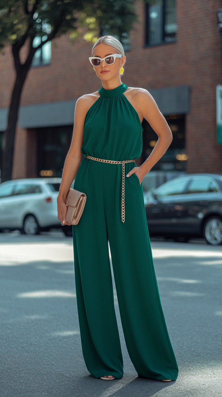 This halter-style emerald green jumpsuit features wide-leg pants and a gold chain belt, perfect for spring events or a Tate McRae concert. Its minimalist yet chic design pairs beautifully with a neutral clutch, ideal for summer evenings or Coachella.