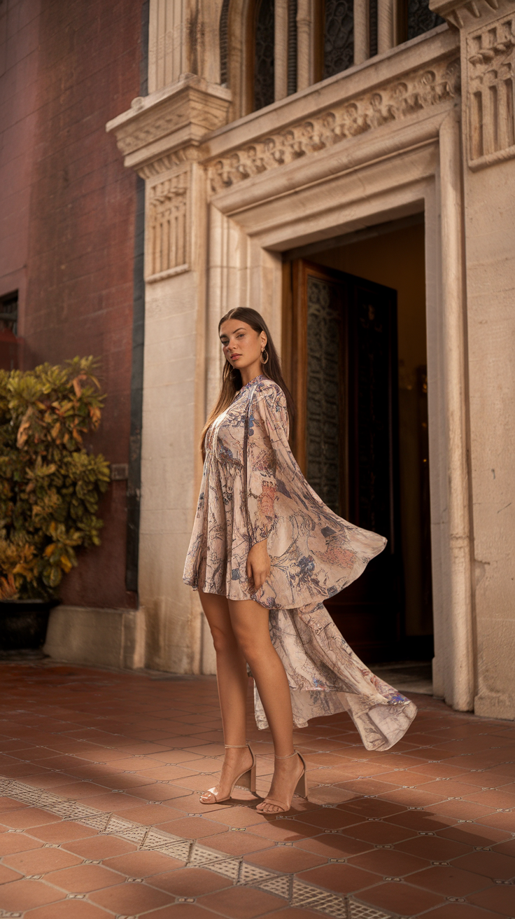 This delicate high-low dress features a light, flowing fabric with intricate floral and abstract patterns, perfect for spring events or Coachella. Its breezy silhouette and neutral-toned heels make it a versatile choice for autumn-winter outings or Eid celebrations.