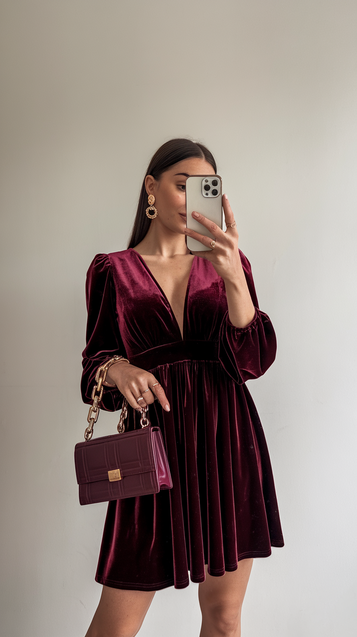 This burgundy velvet mini dress features a plunging neckline and puffed sleeves, perfect for de outfits para año nuevo or Katy Perry concert nights. Paired with a matching handbag and statement gold earrings, it’s an elegant option for spring events or Coachella.