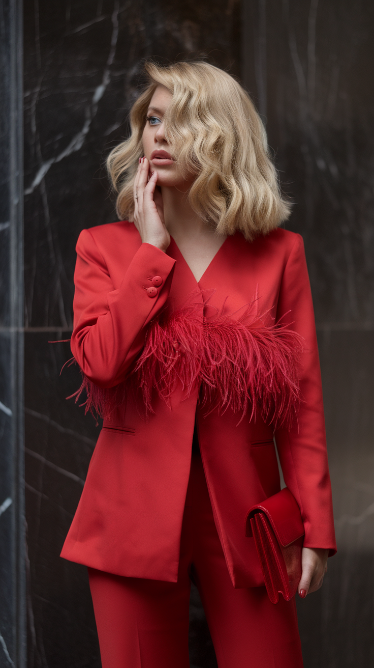 This bold red suit features a tailored blazer adorned with a feathered trim across the chest, paired with matching slim-fit trousers. Perfect for Christmas or autumn-winter celebrations, the look is completed with a sleek red clutch for added elegance.