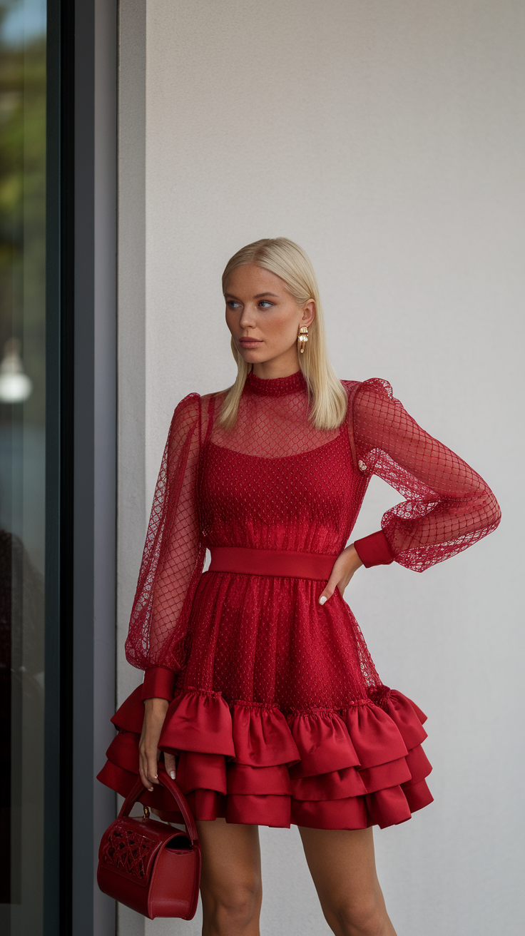 A striking red mini dress with sheer polka-dot sleeves and layered ruffle detailing creates a playful yet sophisticated look. Ideal for de outfits para navidad or a Tate McRae concert, it pairs beautifully with a structured red handbag for a cohesive ensemble.