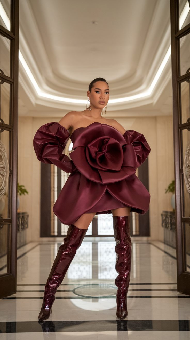 This off-the-shoulder burgundy mini dress features a bold oversized floral design at the front, making it a standout piece for de outfits para año nuevo or autumn-winter events. Paired with glossy burgundy over-the-knee boots, it’s a perfect choice for high school celebrations or a Coldplay concert.