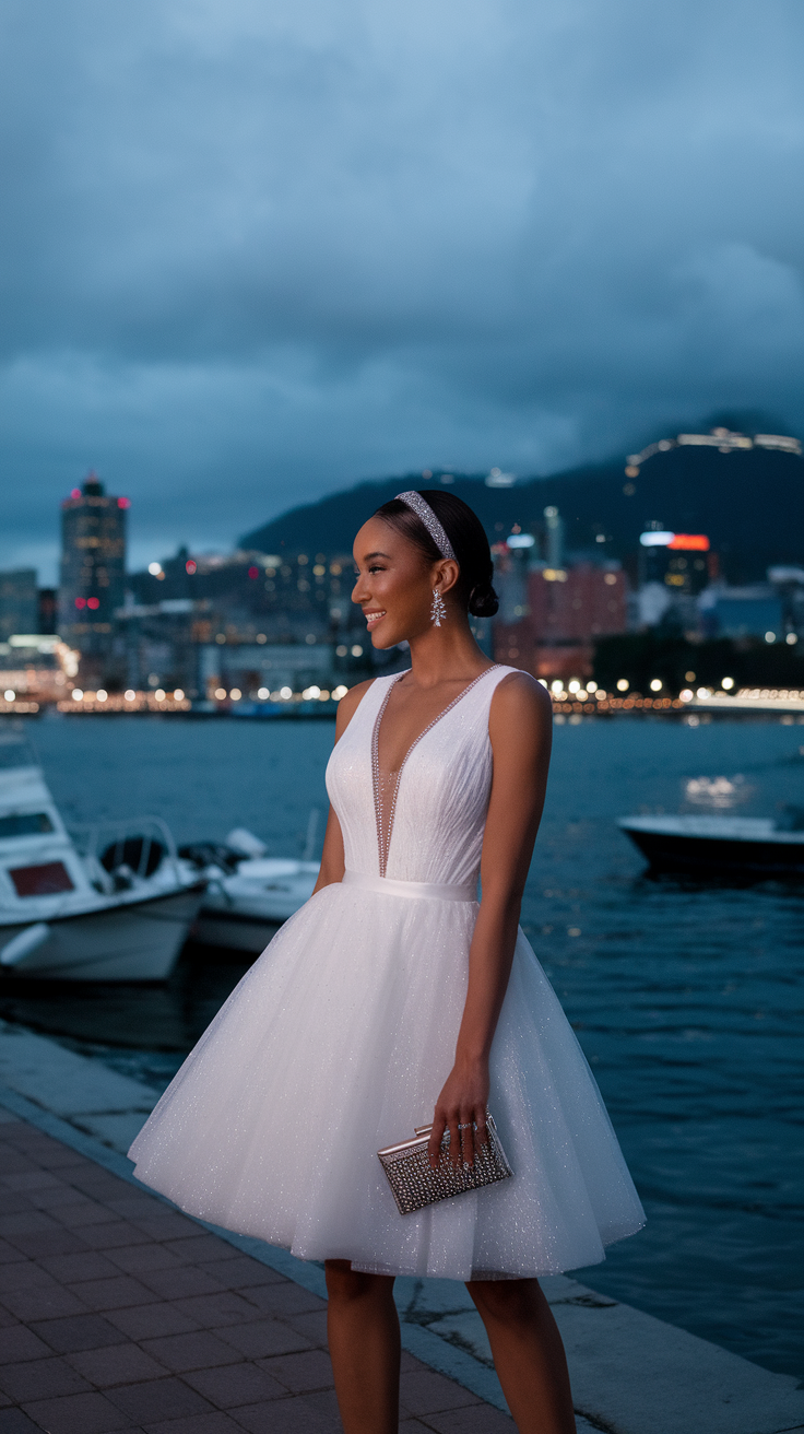 This white sleeveless dress with a plunging neckline and glittering tulle skirt is perfect for de outfits para navidad or a Coldplay concert. Styled with a sparkling clutch and rhinestone headband, it’s a glamorous option for hiver or class of celebrations.