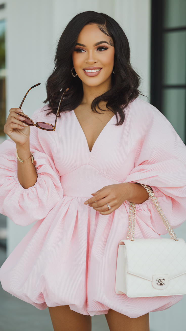 This pastel pink mini dress with voluminous balloon sleeves and a fitted waist exudes femininity, perfect for spring events or Coachella evenings. Paired with a white quilted handbag, it’s a trendy look for de outfits para año nuevo or Tate McRae concert nights.