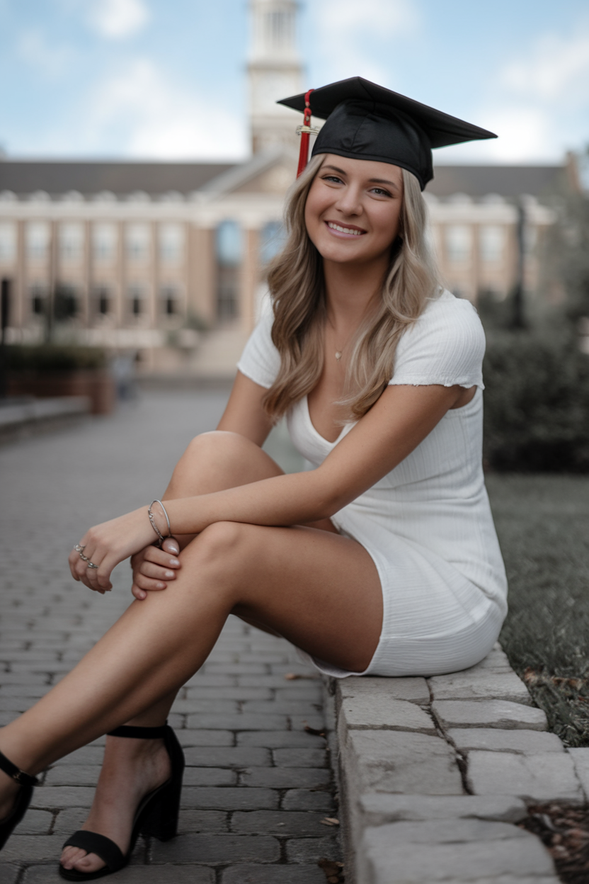 This sleeveless white dress features a structured bodice and flared skirt, creating a timeless and simple graduation look. The clean-cut design paired with transparent heels gives a modern, minimalist feel, ideal for a University or college photo shoot. Styled with gold hoop earrings, this outfit is perfect for a polished pic or celebratory caption.