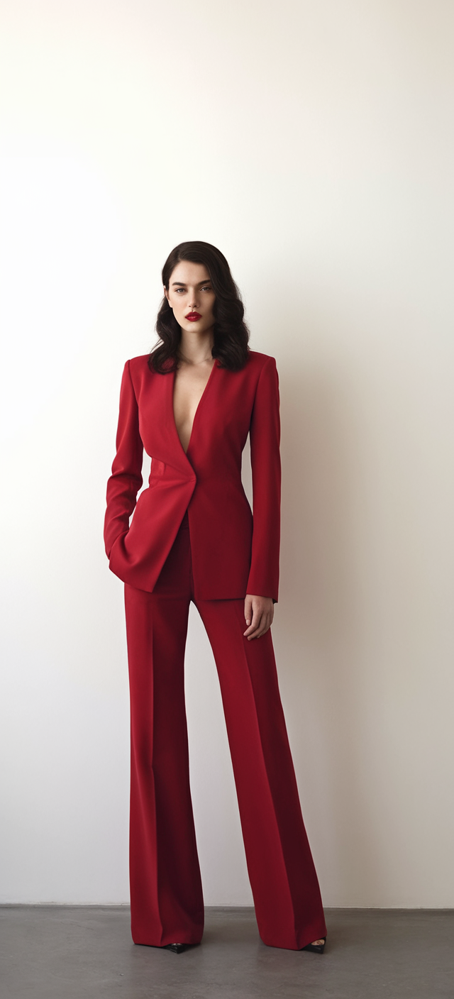 A striking red tailored suit makes a bold statement for a University or college graduation celebration. The fitted blazer with a deep V-neckline adds elegance, while the wide-leg pants offer a polished and confident look. Styled with red lips and black heels, this outfit is perfect for a dramatic photo shoot or a statement-making story Instagram.