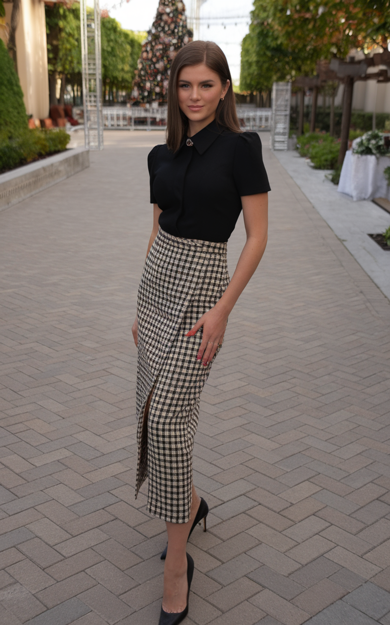 A refined mix of structure and style, this outfit features a tailored black blouse with short sleeves and a chic buttoned collar. The high-waisted plaid midi skirt adds a sophisticated contrast, complete with a front slit for a modern touch. Paired with black pointed-toe heels, this graduation look idea 2025 is perfect for a polished photoshoot or college event.