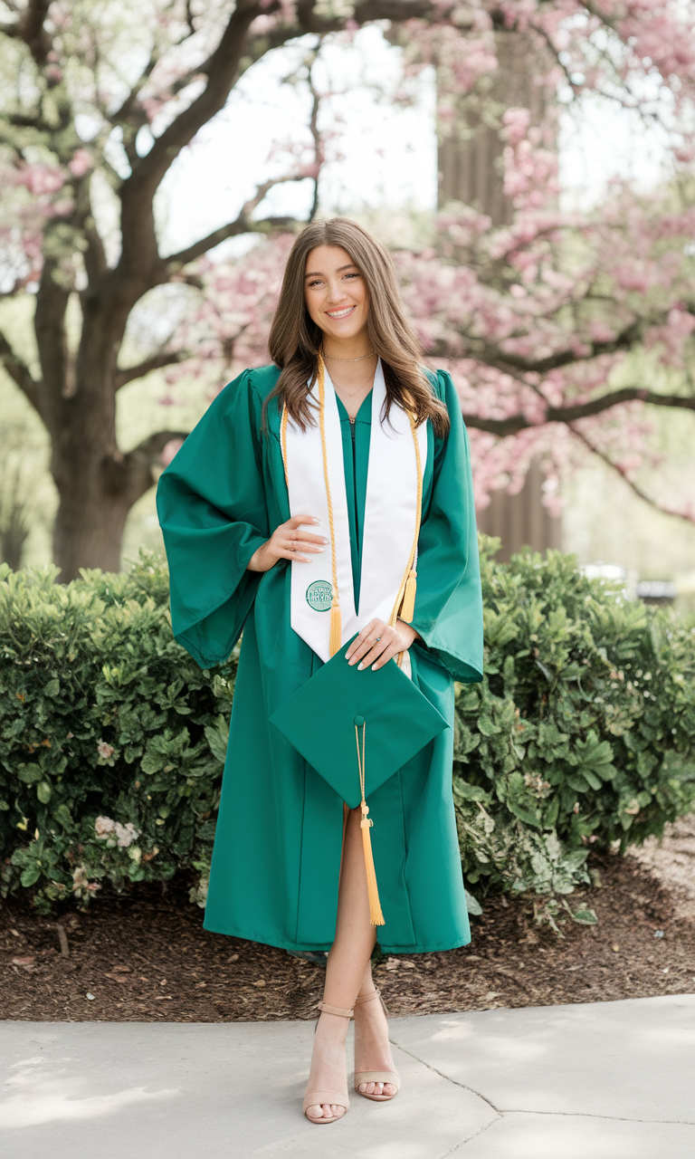 This college graduation outfit showcases a flowing green gown with gold-accented details, creating a polished yet effortless natural aesthetic. The white stole and gold tassel add a sophisticated touch, perfect for a studio photoshoot or a meaningful group photo. Paired with strappy heels and minimal jewelry, this look is a stunning choice for a photo shoot with family.