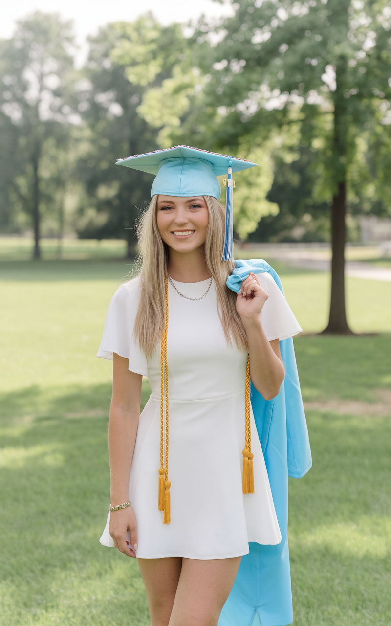 This simple and youthful white fit-and-flare dress is a timeless choice for a University graduation day. The short flutter sleeves and structured waist create a flattering silhouette, while the sky-blue cap and gown add a vibrant contrast. Styled with gold honor cords and delicate jewelry, this outfit is perfect for a celebratory photo shoot or story Instagram.